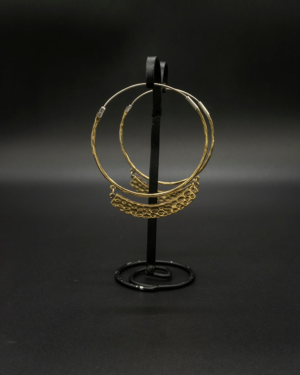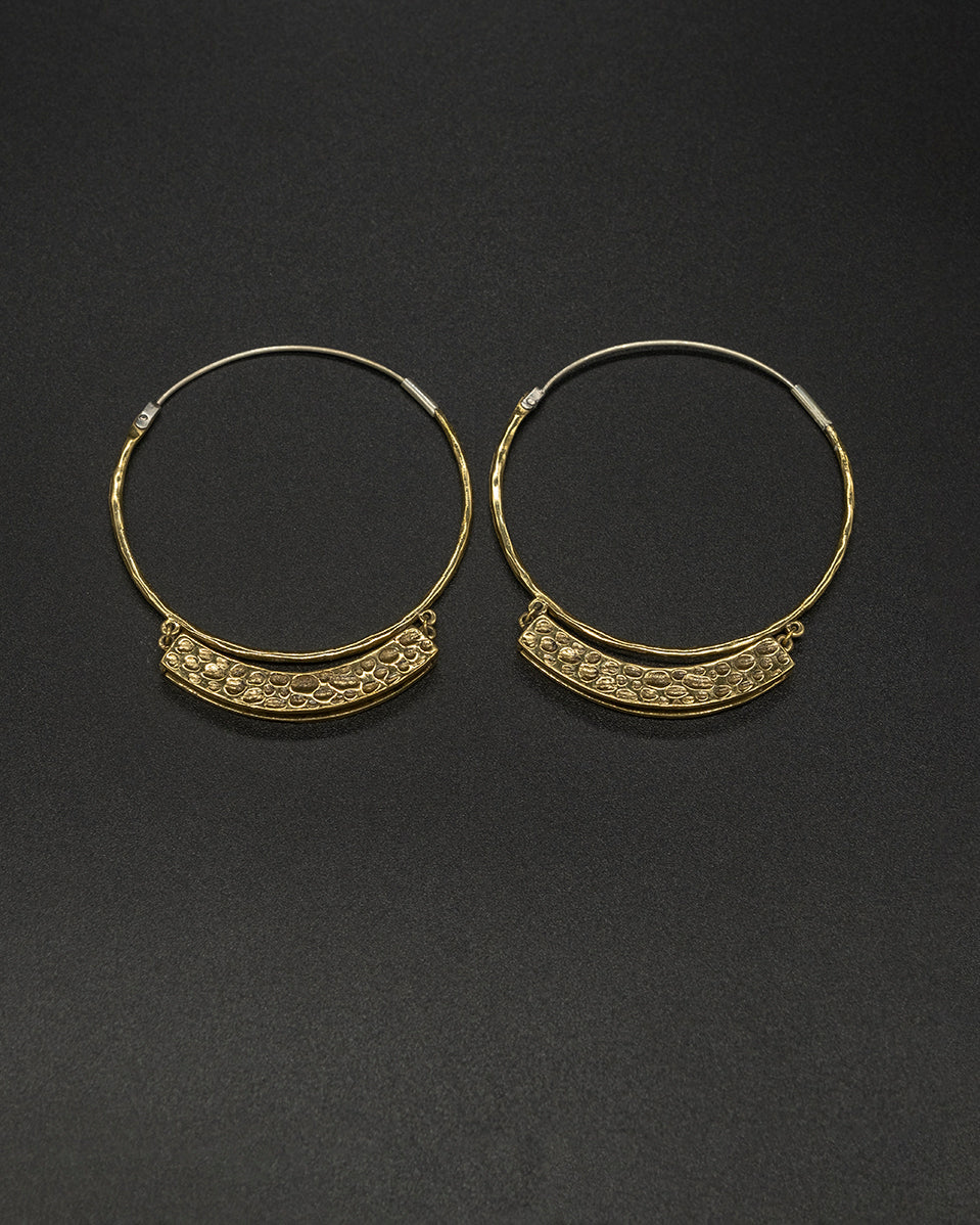 Handcrafted brass hoop earrings with a distinctive hand-textured finish. Featuring a warm golden tone and subtle surface detail. each pair showcases artisanal character and timeless form.