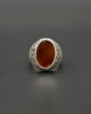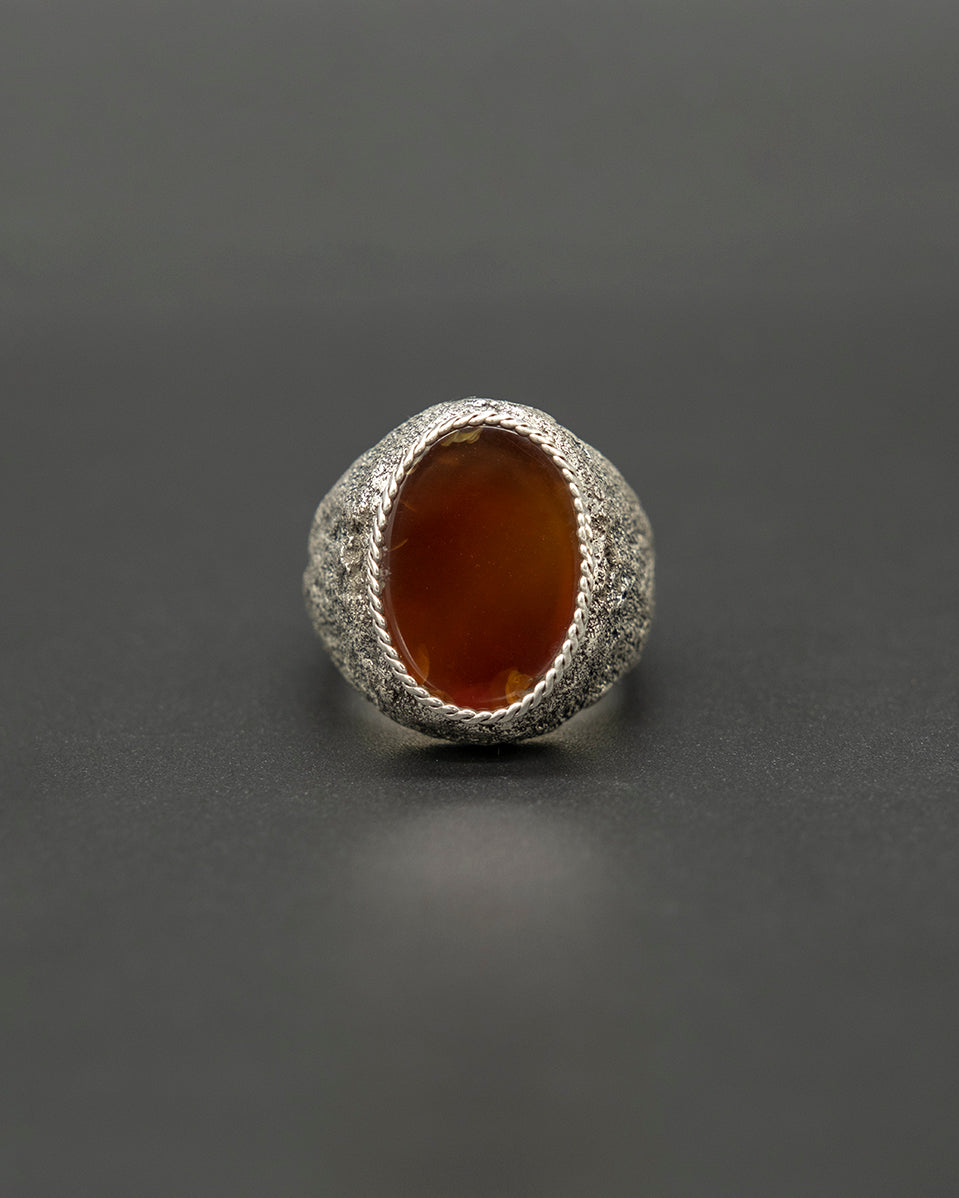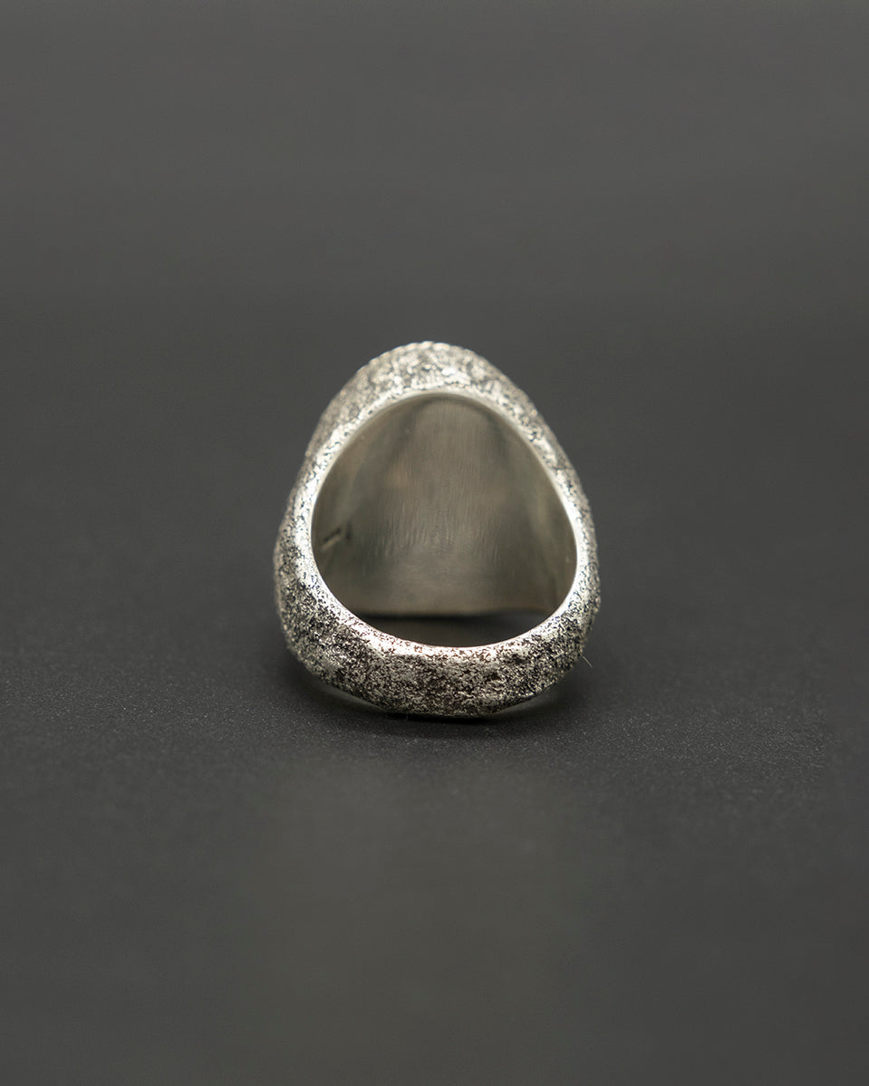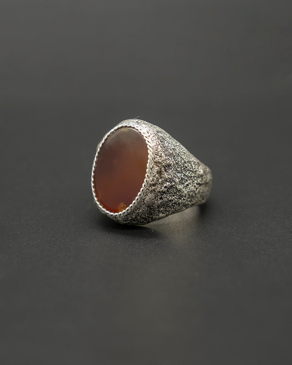 A silver-dusted signet ring set with a natural agate stone. blending raw elegance with quiet strength. The textured silver gives it an ancient. lived-in character. while the agate center adds grounding energy. A timeless piece with subtle tribal soul.