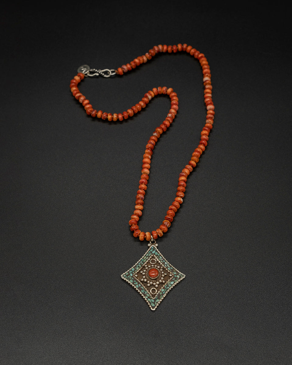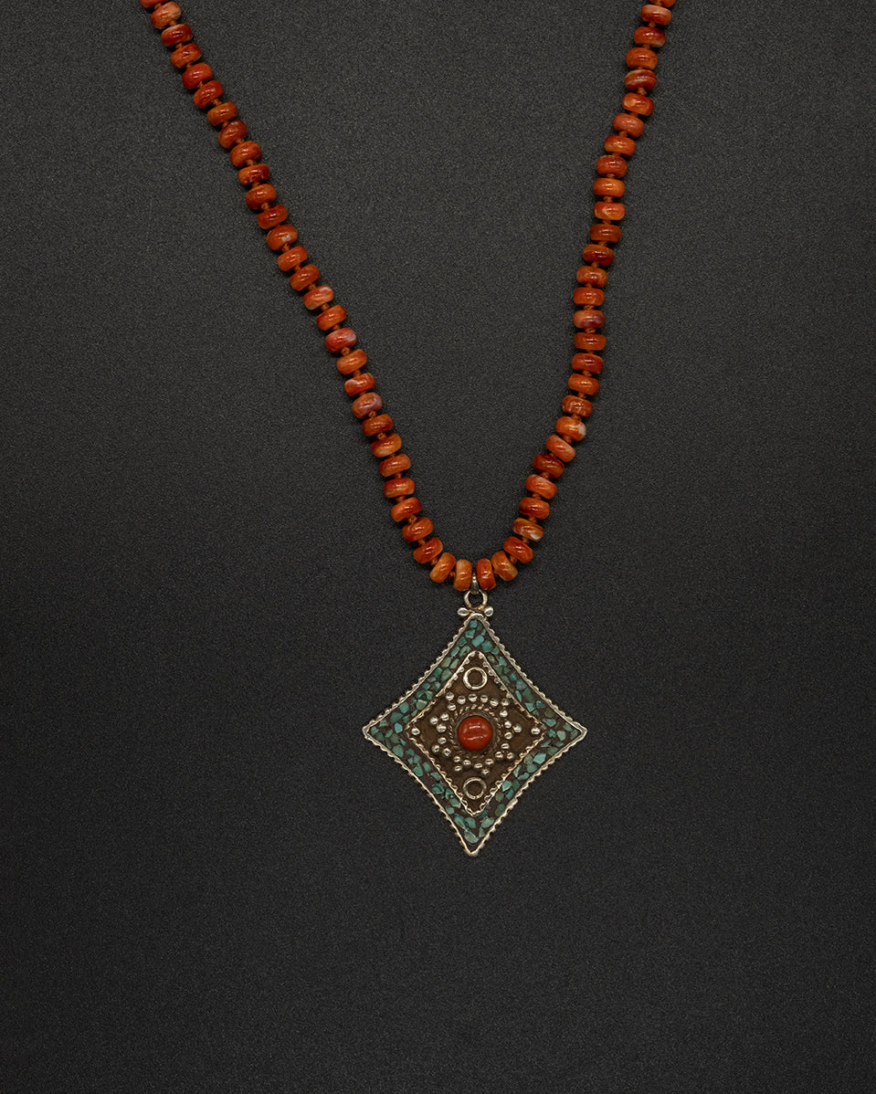 A vintage Tibetan turquoise and coral pendant rests beautifully on a shell chain. blending natural textures with timeless charm. This necklace carries a sense of protection. harmony. and spiritual strength. making it a meaningful talisman for everyday wear.