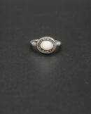 A glowing white opal sits beside a sparkling diamond. set in hand-crafted silver. The stone’s shifting white fire dances against the clean. luminous sparkle of the diamond—an elegant balance of mystic and modern. Dreamy. refined. and quietly enchanting.